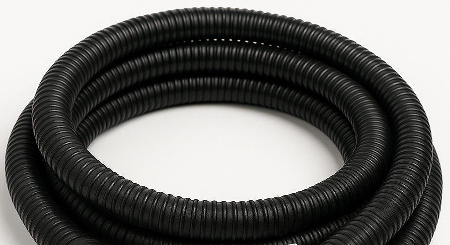 A realistic product image of an 8-foot long black replacement hose for a tanning system, coiled neat Published June 20, 2025 at 894 × 488 in Hose Flex, for Sidekick or Sidekick Mini ← Previous